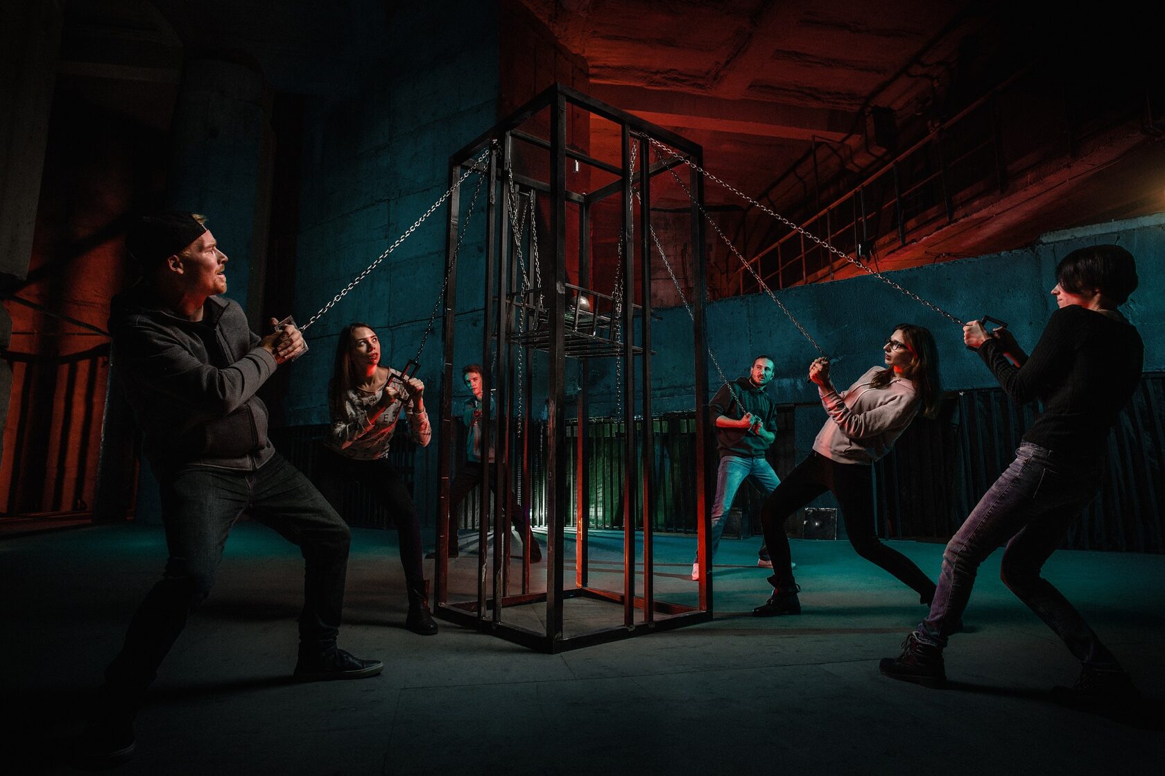 Обходите храм слева, далее по пешеходному мосту через Москву-реку до первого спуска по лестнице с правой стороны. Далее идете по набережной, река справа. Напротив входа в ресторан «Магадан» увидите большую парковку и железного тиранозавра. Вход к нам — за тирексом, под большой табличкой с желтой надписью «Игра Железяки».